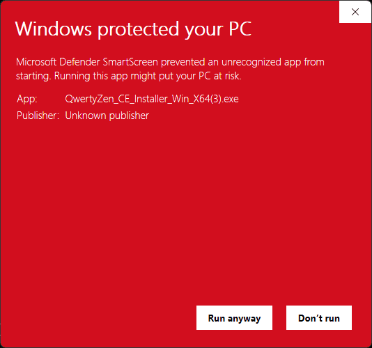 QwertyZen is still in its early days so Windows Defender might complain that the software is not trusted. See this Microsoft article for more information.